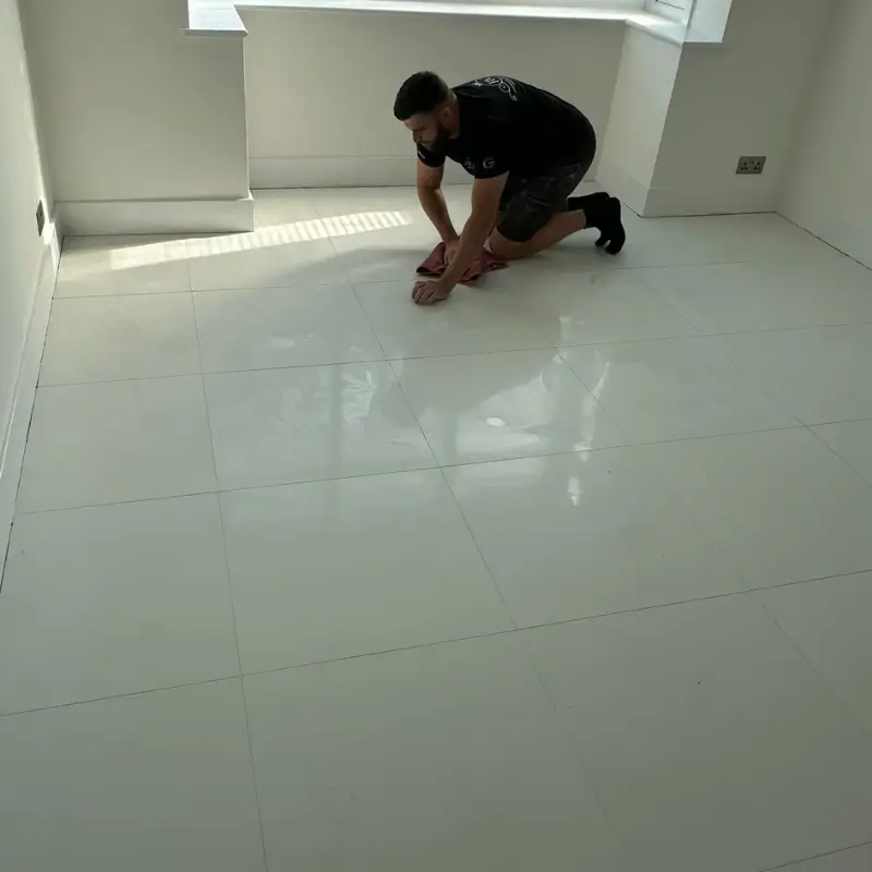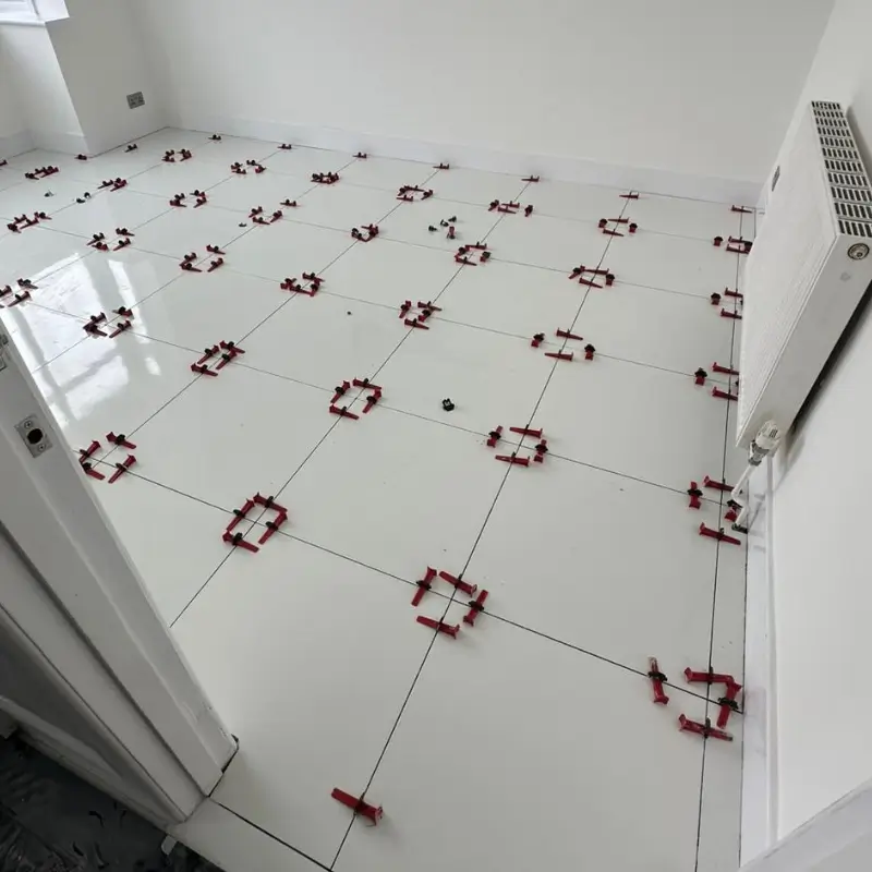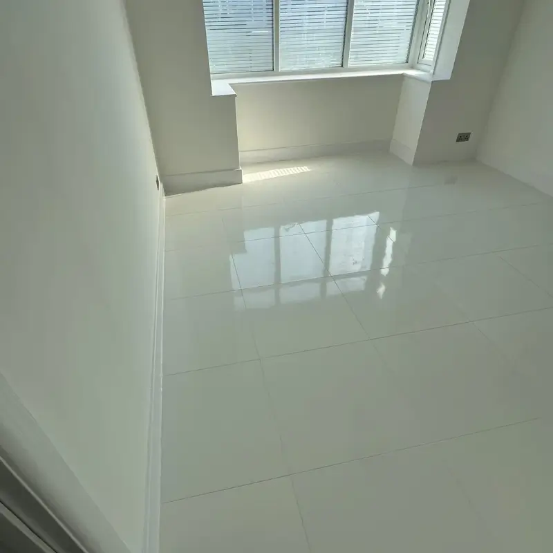 - Precision Laying: The white porcelain tiles were professionally laid with meticulous attention to detail. Our team used a high-quality adhesive suitable for porcelain to ensure a strong, long-lasting bond. We paid close attention to the layout to minimise cuts and create a seamless, elegant flow across the entire dining area.